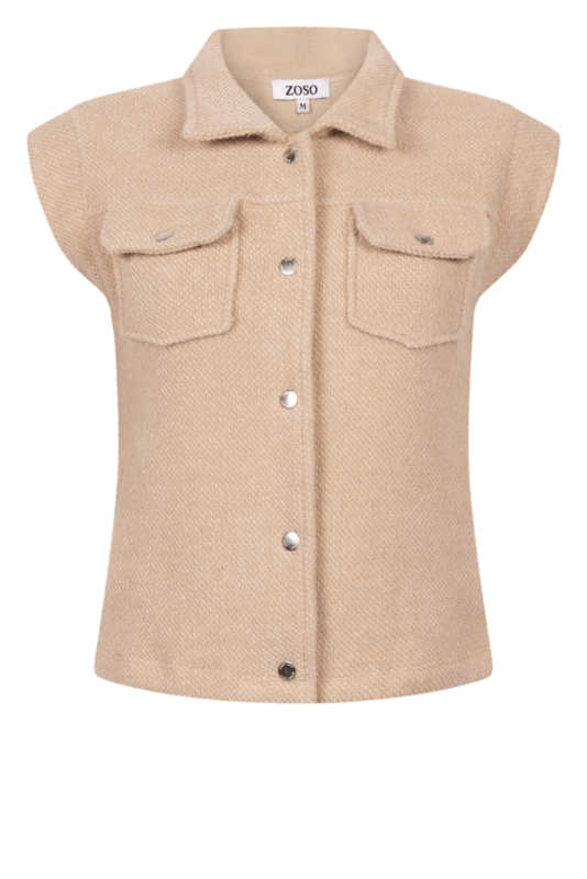 Het Zoso mouwloos jasje in zandkleur is een eigentijds item dat je garderobe meteen een frisse update geeft. Dankzij het korte model en de praktische ritssluiting is dit jasje zowel stoer als makkelijk te dragen. De kraag zorgt voor een klassieke basis, terwijl de verstelbare knoopdetails langs de zijkant een speelse en modieuze twist toevoegen.