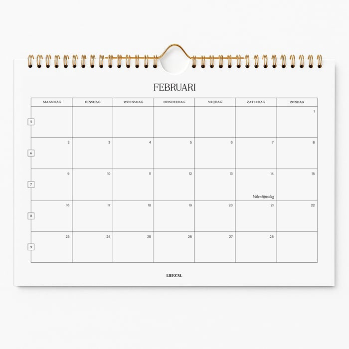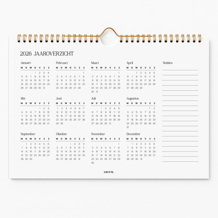De planner heeft een luxe uitstraling dankzij de messing wire-o binding en een rustige, duidelijke vormgeving. Op de eerste pagina vind je een handig jaaroverzicht, en elke weekpagina bevat duidelijke weeknummers.