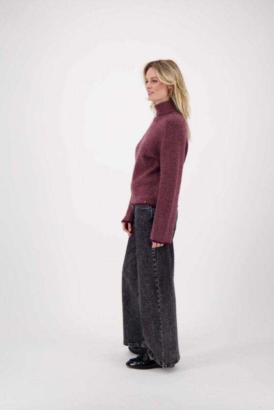 Deze coltrui van Zusss is uitgevoerd in een zachte aubergine tint en biedt zowel comfort als stijl. Het gekleurde glitterboord geeft de trui een opvallend accent, waardoor het ontwerp direct een moderne uitstraling krijgt.