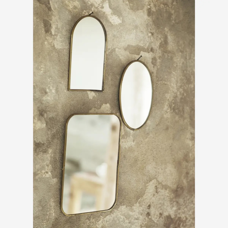 Dit charmante spiegeltje van Madam Stoltz is verkrijgbaar in een ovale vorm of met een ronde bovenkant en heeft een compact formaat van circa 10 x 15 cm. Het spiegeltje is voorzien van een metalen rand in antiek messing, wat een warme en klassieke uitstraling geeft.
