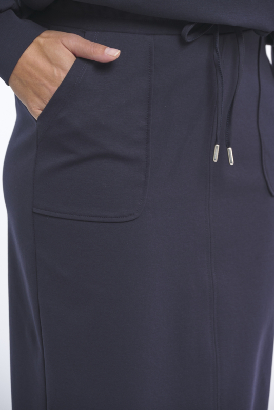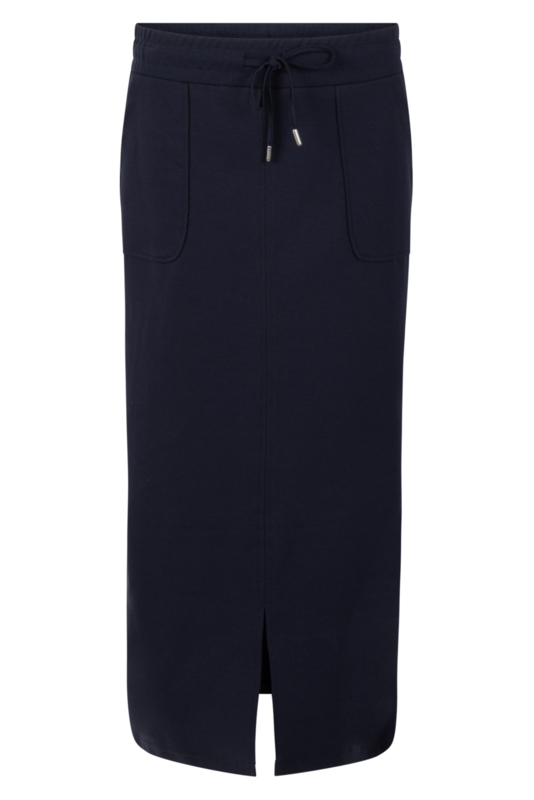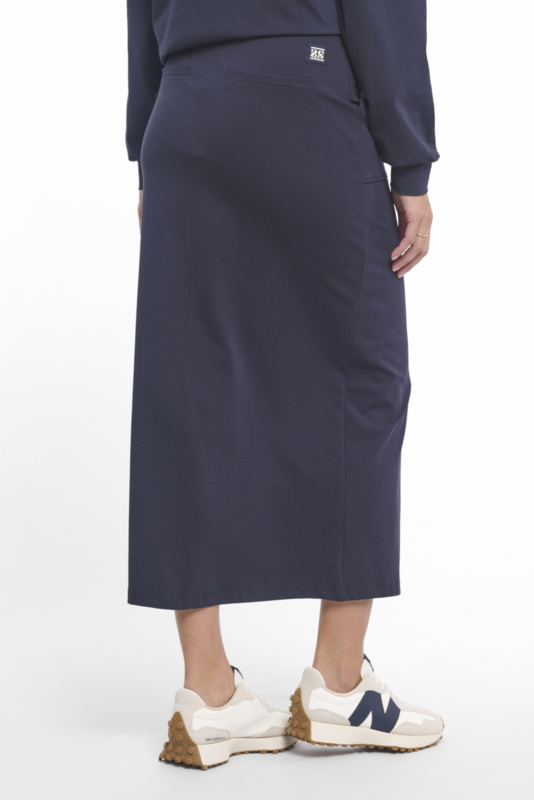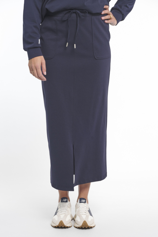 Deze moderne rok van Zoso Fashion is uitgevoerd in een donkerblauwe die je eindeloos kunt combineren. De rok is voorzien van twee praktische steekzakken aan de zijkant, wat zorgt voor een sportieve en comfortabele look. Aan de voorkant bevindt zich een subtiele split die niet alleen zorgt voor een eigentijds detail, maar ook extra bewegingsvrijheid biedt. Dit maakt de rok geschikt voor dagelijks gebruik én voor een meer geklede gelegenheid.