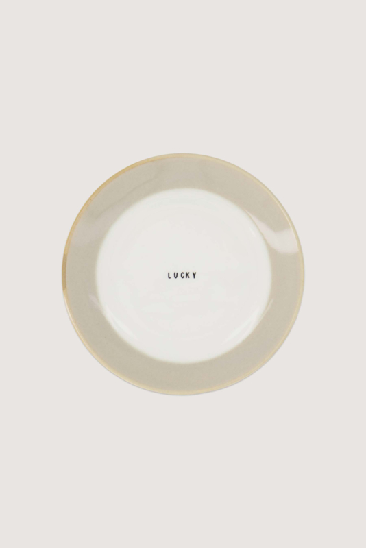 Dit Zusss gebaksbordje is een kleine blikvanger op tafel. De zandkleurige rand geeft het bordje een warme, rustige uitstraling en in het midden staat de subtiele tekst ‘lucky’. Een lieve toevoeging die elk koffiemoment net wat extra charme geeft.