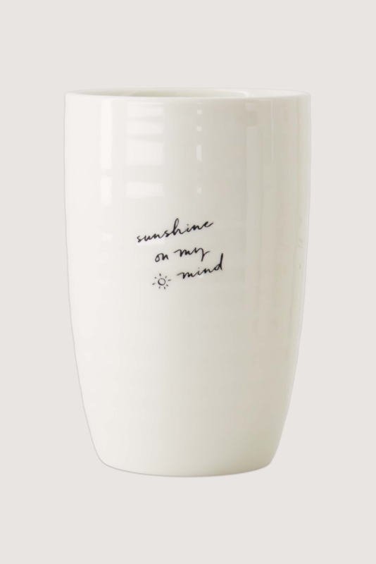 Start je dag met een zonnig gevoel met deze Zusss mok L. Op de voorkant staat de tekst ‘sunshine on my mind’ in sierlijke schrijfletters, een vrolijke boodschap die elke ochtend een glimlach geeft.