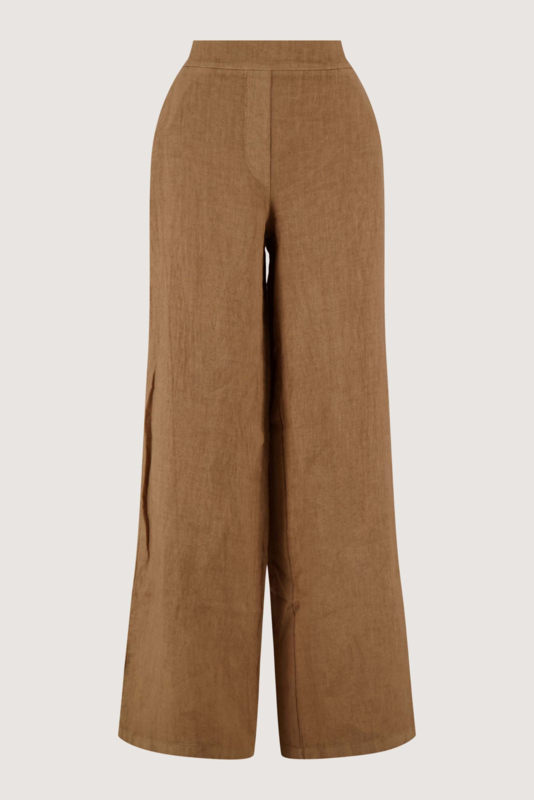 De Zusss linnen broek heeft een wijdvallend model, is gemaakt van een ademende stof en komt in een donkere zandkleur. Een fijne basis voor een comfortabele en moeiteloze outfit.