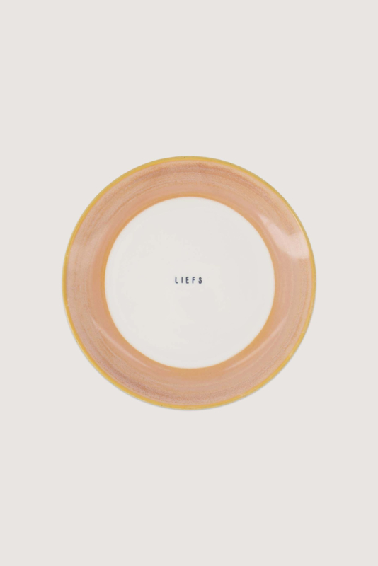 Dit Zusss gebaksbordje met lichtroze rand geeft je tafel een warme, gezellige uitstraling. In het midden staat de tekst ‘liefs’, een lieve reminder om even stil te staan bij een kop koffie en iets lekkers.