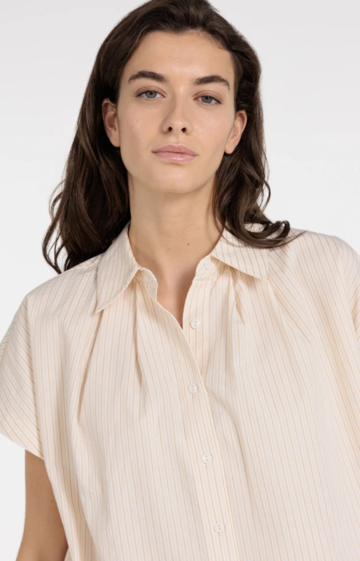 De losse pasvorm draagt heerlijk en valt soepel. De klassieke kraag en knoopsluiting zorgen voor een rustige basis, terwijl de subtiele plooien bij de schouders net wat extra geven. De kleine knoopjes langs de zijkanten maken de blouse speels en net even anders.