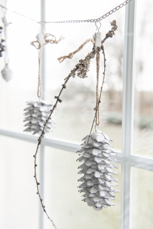 Metalen dennenappel aan stoer touw voor in een krans, de ketting-clib uit onze collectie of in een schaal. Combinaties genoeg met deze leuke metalen winterserie.
