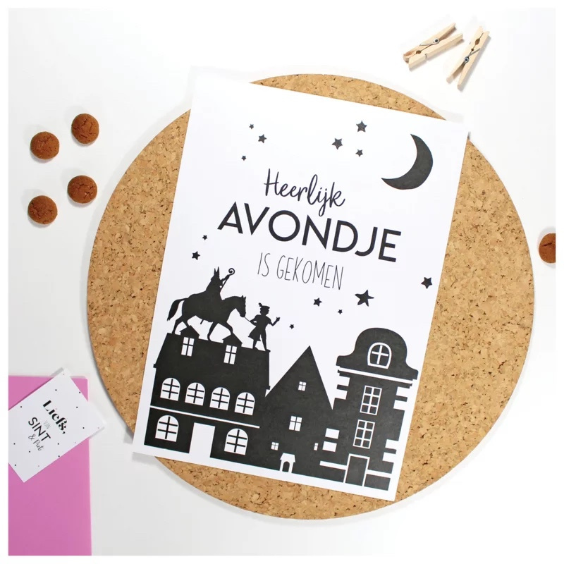 Poster in A4 Formaat, verwelkom Sint & Piet in huis met deze superleuke poster: Heerlijk avondje is gekomen! De poster is geprint op 340 grs papier met ruwe matte uitstraling.