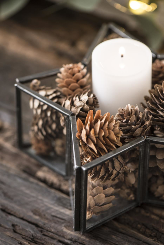 Waxinehouder van metaal en glas in de vorm van een ster.