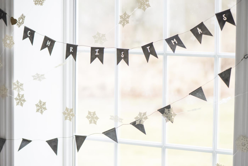 Slinger van zink, kleine vaandeltjes met de tekst: m e r r y c h r i s t m a s.