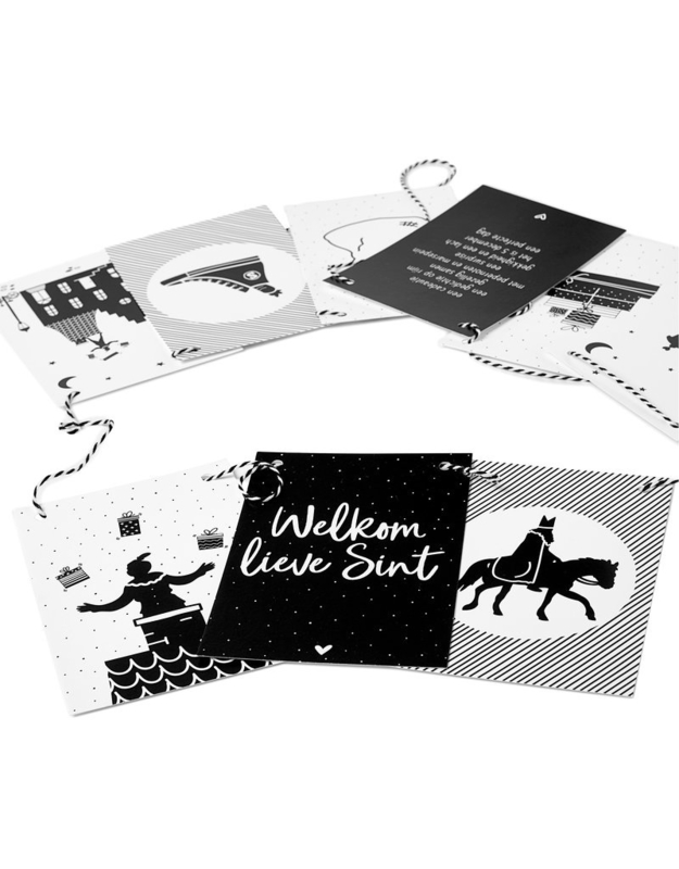 Met deze sinterklaas slinger breng is meteen de sfeer van 5 december in huis. De slinger bestaat uit 9 verschillende witte kaarten met illustraties, leuke quotes en patroontjes. In de kaarten zitten 2 gaatjes en kunnen zo makkelijk opgehangen worden aan het bijgeleverde zwart wit touw.
