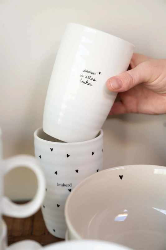 De Zusss mok, extra groot met een hoogte van 13 cm, is een stijlvolle en opvallende toevoeging aan je serviescollectie. De mok heeft de tekst 'samen is alles leuker' aan de voorkant. Deze extra grote mok is ideaal voor royale koppen koffie, thee, cappuccino of andere warme dranken.